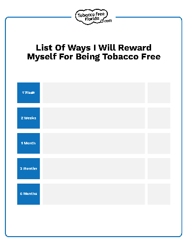 Throughout your journey, reward yourself for each milestone you achieved! Make a list of ways you’ll reward yourself and use them as motivation throughout your journey. Since you’ll be practicing healthy and positive ways to reward yourself that have nothing to do with tobacco, smoking is no longer associated with a “reward.”